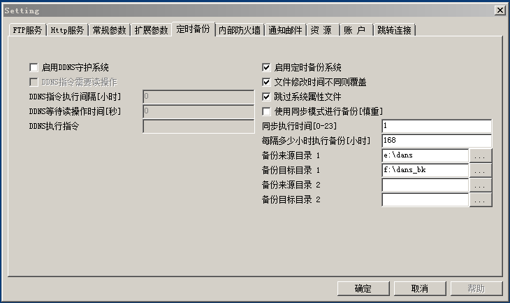 也就是你一共可以指定两对备份操作,这里特别注意,无论是来源目录还是目标目录,都必须是已经存在的目录,如果不存在,你必须创建一个空的目录,为什么要必须存在呢,因为可以将一个磁盘映射为一个目录,如果发生了磁盘掉盘事件,如果自动创建目标目录的话,会导致写入错误的磁盘,用这个方法可以避免掉盘事件引发的写入错误磁盘.