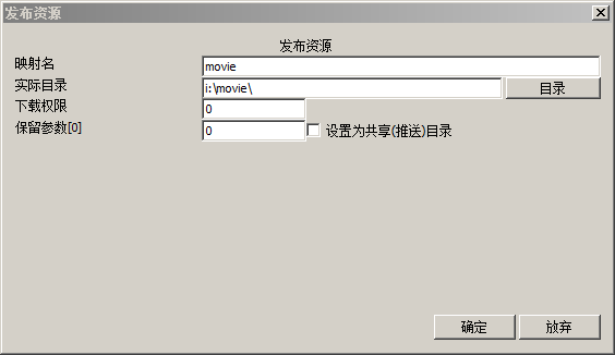 资源页面其实对应的是myshare.txt配置文件,这里是用来设置服务器发布目录的,您可以使用右键菜单来执行操作,也可以通过双击一个项目进行修改,为了适应Linux平台的配置,这里没有对目录是否存在进行强制验证. 保留参数请设置为0,这个参数是为了保留和最早的配置文件兼容而保留的,原来的定义是上传权限,但是新版本中由于上传统一集中到备份模式,这个参数就无效了,请设置为0.这里特别注意,从2021.10.01版本开始,支持共享目录[推送目录],这个目录的作用是,所有账户在备份模式下,都可以将自己的文件复制或者剪切到这个目录下,实现备份目录隐私,但是可以直接决定部分文件共享,实现一种平衡.