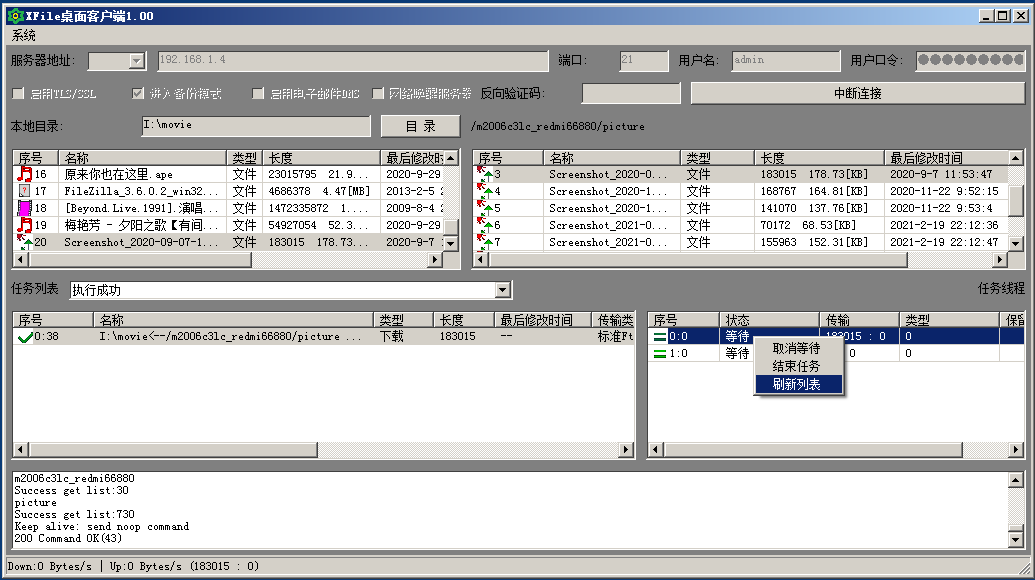 该菜单只在备份模式下激活,和默认下载对应,如果是单个文件,则使用标准FTP上传,如果是多个文件,则将多个文件聚合,使用聚合传输协议上传,如果是目录,则使用聚合传输执行目录上传操作.