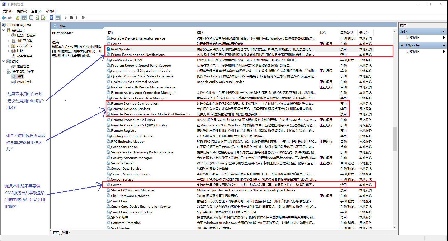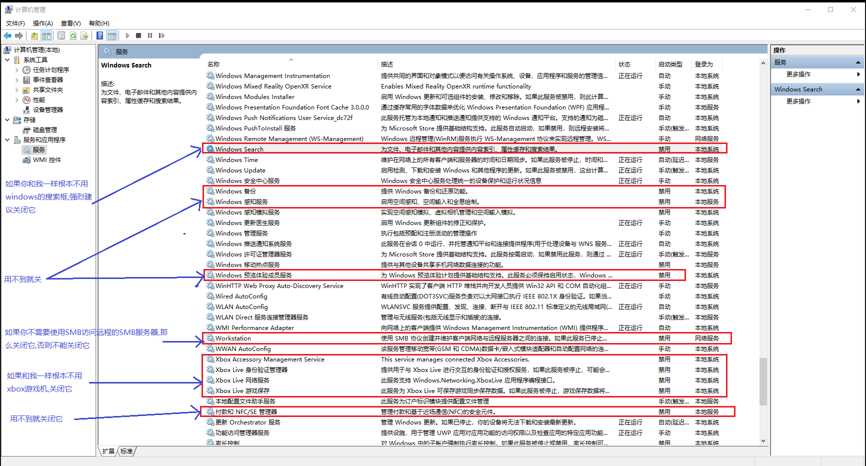 [2] 建议在 计算机管理 --> 服务和应用程序-->服务 里关闭以下红框内列出的后台服务