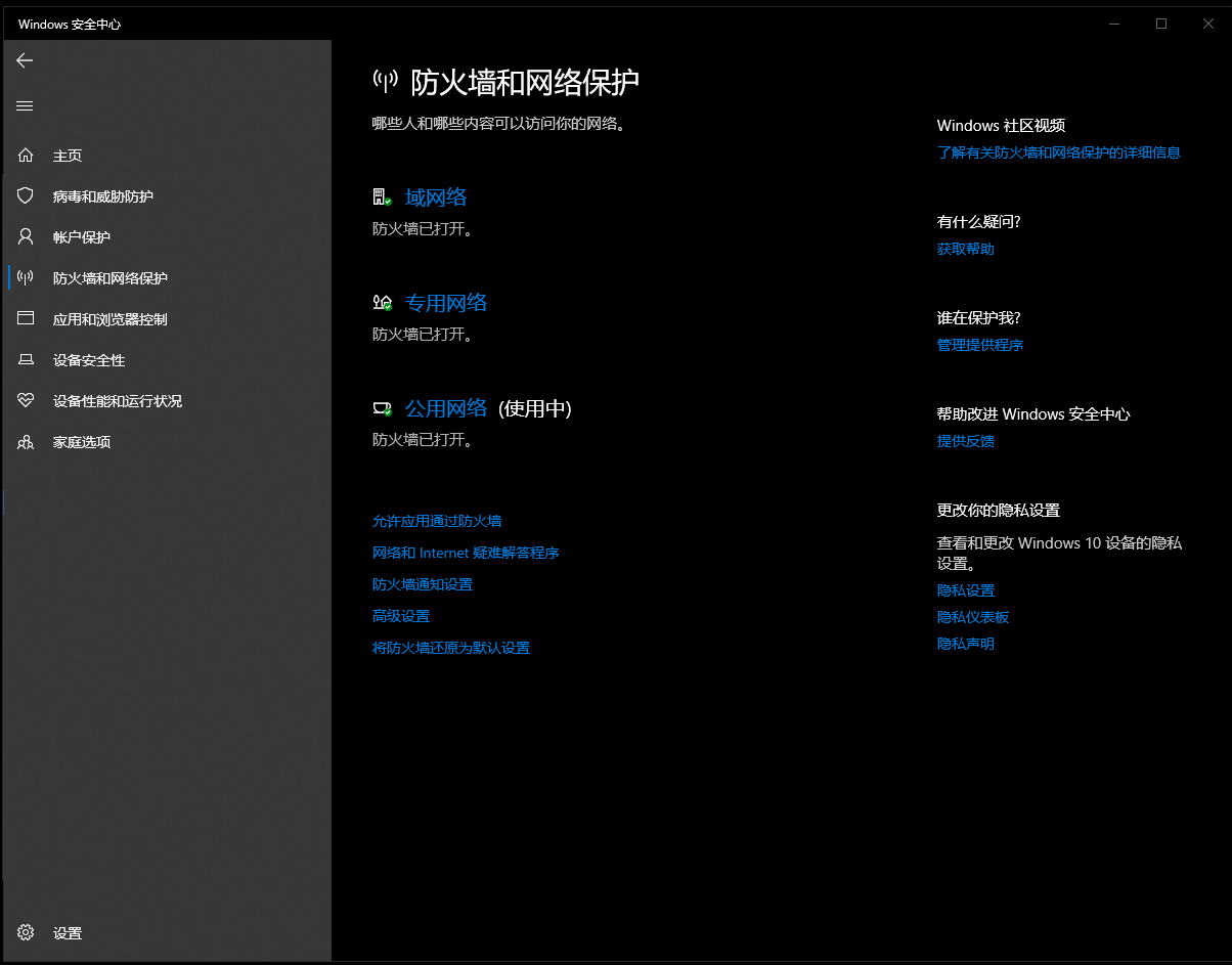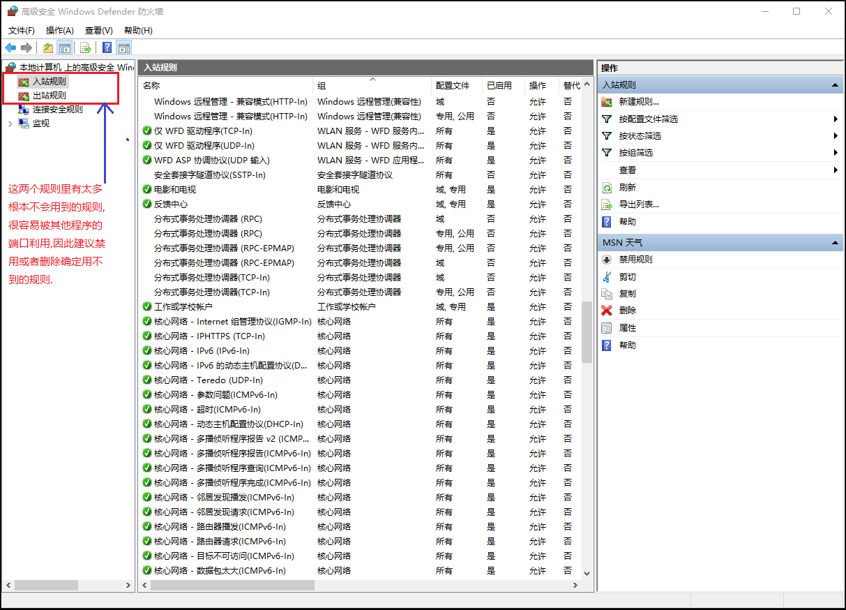 [4] Windows安全中心-->防火墙和网络保护-->高级设置,建议将部分你用不到的软件,类似media center类,远程协助类等,自己有把握肯定用不到的,可以直接删除条目,没有把握的,可以右键禁用,默认情况下,为了兼容性,window10开了一大坨各种允许连入连出规则,例如,我使用vlc和mpv做播放器,根本不用windows自带的media player系列,但是它默认开了一大对规则,因此我全删了禁止了,这个处理适合熟练用户,根据需要自行决定.