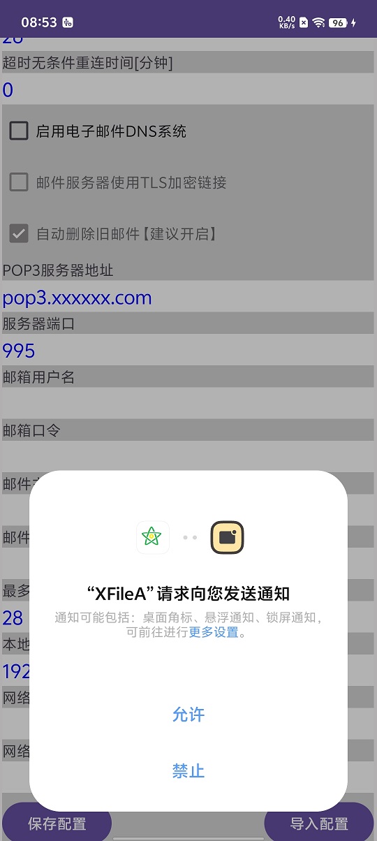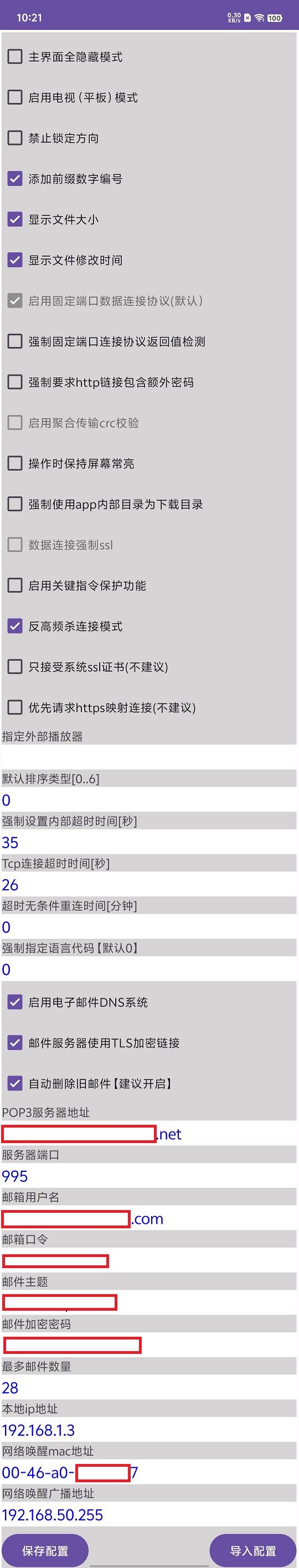 下拉到最下面,点一下 导入配置 按钮, 在android 13或者以上版本里,可能会申请多达5次的权限 , android 12或者以下版本一般只需要申请1个到2个权限,非常抱歉,但是这是android高版本里强制规定的,我也没有办法,虽然这里实际可能只需要申请通知和管理本地所有文件权限,但是我把所有的权限都给做进去了,因为这个权限这块android各种版本一直在瞎折腾,索性一次性全放出来了 ( 在4.08版本或之后的版本, 也就是2025.09.01版本里,我们这里进行了收缩,不再一次性申请照片等权限,改为在备份或者上传的时候才申请)