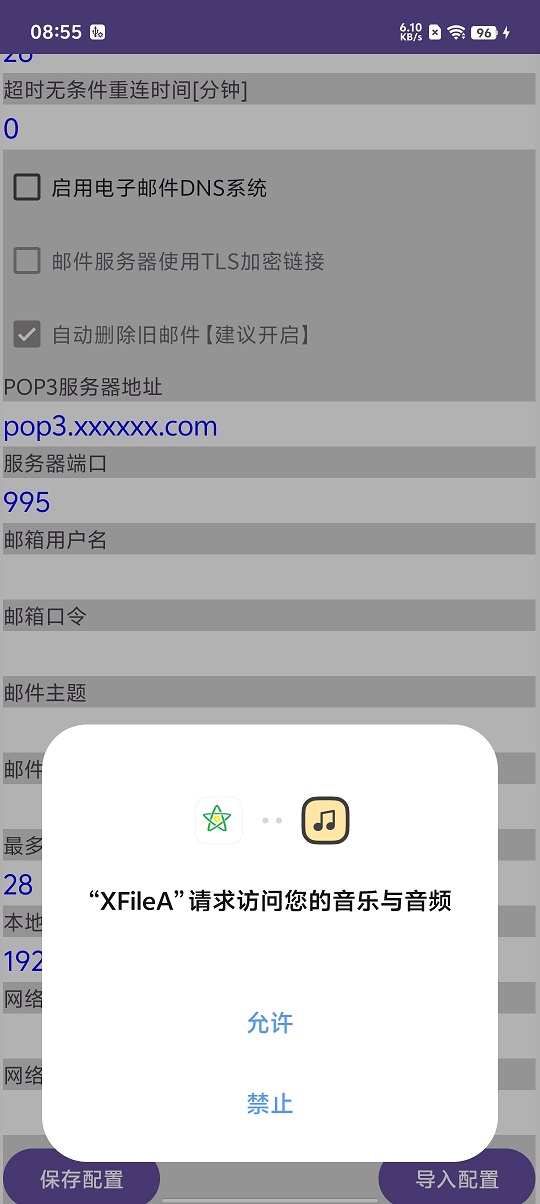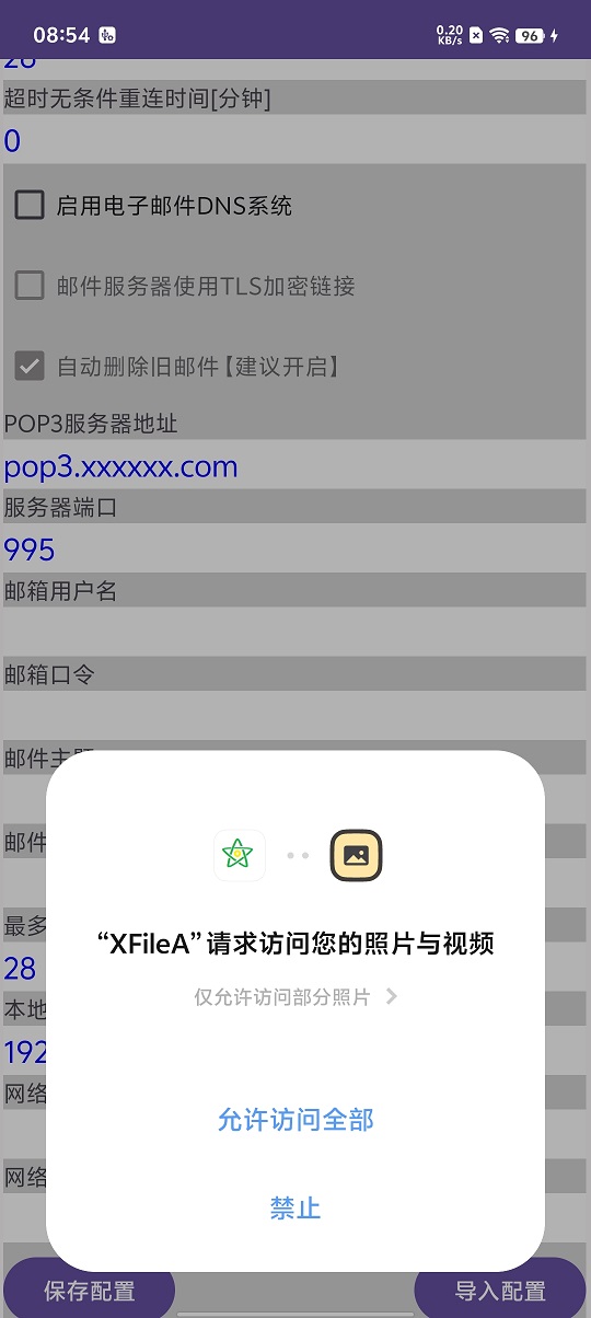然后返回XFileA的高级设置界面 ,继续按 导入配置 按钮 , 出现这些额外请求的设备是您的Android系统版本大于等于13,如果您使用的是4.00版本(2025.05.01), 会出现申请访问本机视频和照片的请求,如果使用的是4.08版本或者以上版本,这里则不再继续请求照片和视频等权限,统一等需要用到备份或者上传功能的时候才申请.