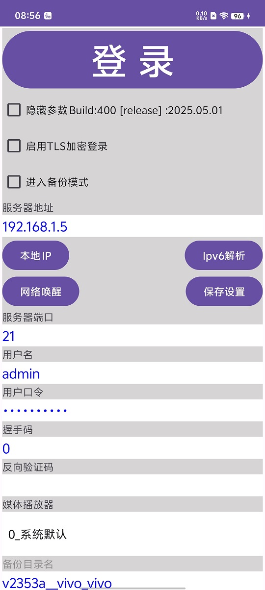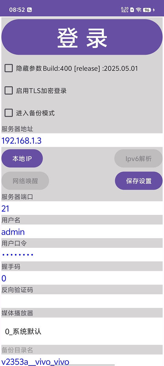 隐藏参数 Build : 400 [release] 2025.05.01 : 如果您勾选了它,那么会自动隐藏下面的设置部分,整个界面就剩下 登录 按钮 和 隐藏参数选择框 , 注意 , 您勾选这个的同时,会自动调用保存设置功能,保存你最后的设置参数. Build 400 ,这个数字继承了旧版XFtp app的数字, release 说明是正式版,测试版会显示debug , 后面的正式版本的发布参考日期 2025.05 代表是2025年5月份 后面的01是发布次数,同一月份发布最后数字会累加.