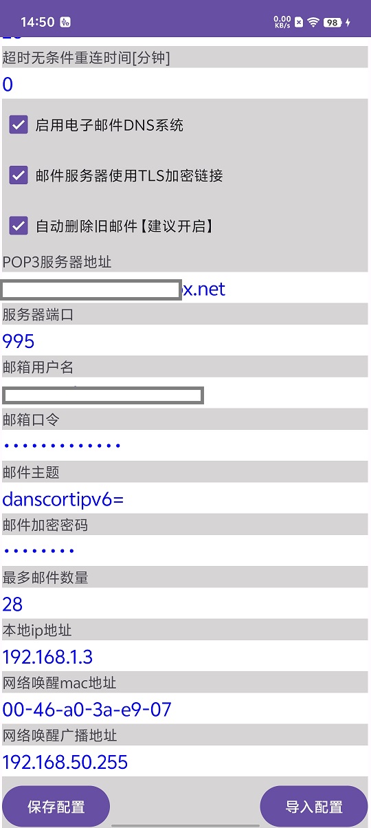 IPV6解析: 这是XFILE软件的特色功能,XFile软件支持从E-mail读取您家服务器的ipv6地址,在您设置完成邮件或者服务器地址功能后,这个按钮就可用,按一下这个按钮,会自动尝试通过e-mail获取您服务器的最新ipv6地址,并填写到服务器地址栏,注意,填写完成后不会自动保存参数,如果您退出app,这个新的ipv6地址不会被保存,您必须手动按 保存设置 按钮或者点一下 隐藏参数选择框,才会保存,其他参数的设置也是一样,必须手动按 保存按钮或者勾选隐藏参数,否则不会在退出的时候自动保存配置参数.