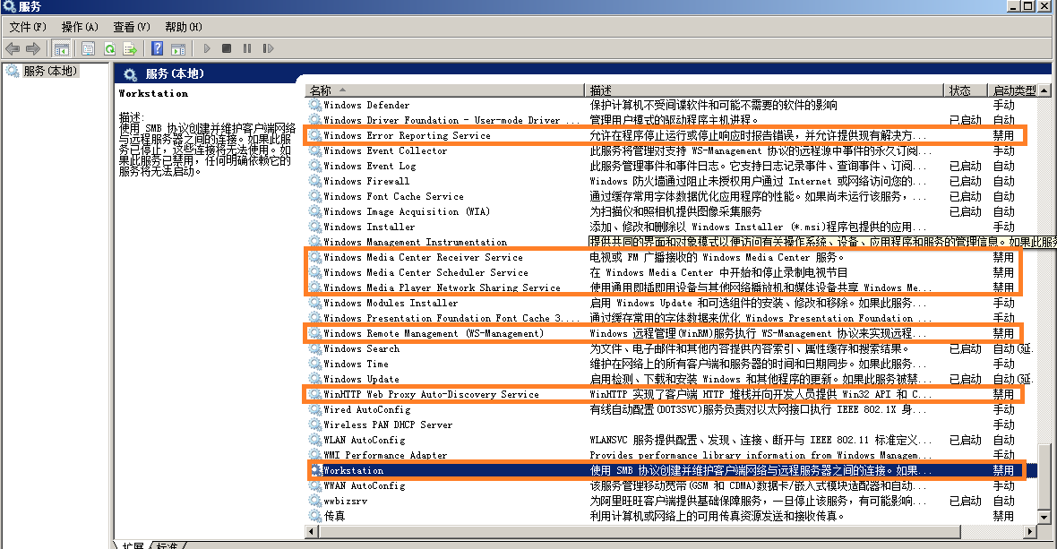 workstation服务,这两个后台服务是windows系统的漏洞之母,如果不需要使用samba,务必禁止这两个自动启动的服务.